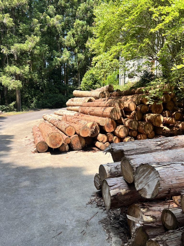 それはろくろ引きの技術を使って皮を落とし、丁寧に削っていただいたからです!もともと300角ぐらいの角材をろくろみたいに回転しながらちょっとずつ削っていって、綺麗な270Φにするという加工をしてもらいました。丸太のサイズを精度よく揃えたかったのと、皮が残っていると虫が湧いてきたりするので、デザインを実現するためには必要な加工でした。作業は愛知県内の業者さんにご協力いただきました。今回手伝ってくれた業者さん全てが県内の業者さんでできたので、それもプロセスとして良かったなと思います。