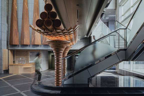 丸太1本が約100kgあるので、実は相当重いです。でも、浮いているように見せることで木の力強さと美しさの両方を表現したかった。そこで、丸太を包み込むように見える網状の部材を使い、軽やかさを演出しています。見えない内部は、五軸加工で精密につくられています。構造は見せないけれど、見る人に「どうなってるんだろう?」と思ってもらえるようにしています。