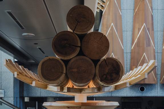 モニュメントをくぐれるように設計しているんですが、実際にくぐって見上げた時の光の入り方や木の量感に驚く方が多いです。高さも大人が手を伸ばせば届く距離で、木に自然と触れてしまう。その触れる距離に木があるということが、今回の木質化の大きな狙いの一つでした。