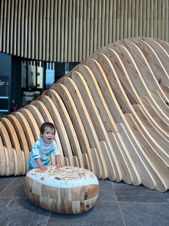 大西:僕らはこれまで家具を作ってきましたが、影響は使う人に限られることが多かったんです。お店やカフェの家具もそうでした。でも今回はビルの共用部という新しい挑戦で、距離的にも気軽に見に行けるのが嬉しかったです。完成後、当時2歳の息子を連れて行ったときも、普段は抱っこばかりなのに、走り回ったりベンチに登ったり、空間をのびのび楽しんでいたのが印象的でした。子供にはわかるんだなーと親としてもPJT担当としても嬉しかったです。