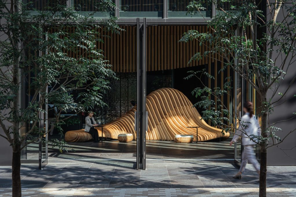 名古屋駅から徒歩5分ほどのところにある、第2名古屋三交ビル。ここは普通のオフィスビルではありません。エントランスに入ると、木材で作られた美しい木材の曲線が広がり、モニュメントのようなベンチが目を引く木材に包まれた空間に圧倒されます。