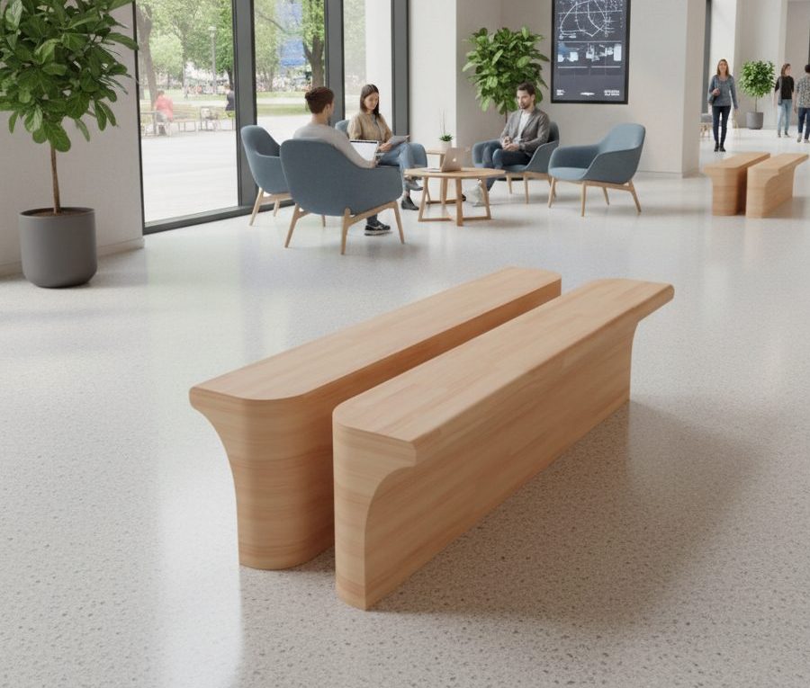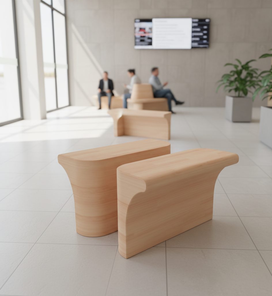 「伸びる」という瞬間の所作を、木の温もりの中にとどめた造形ベンチです。