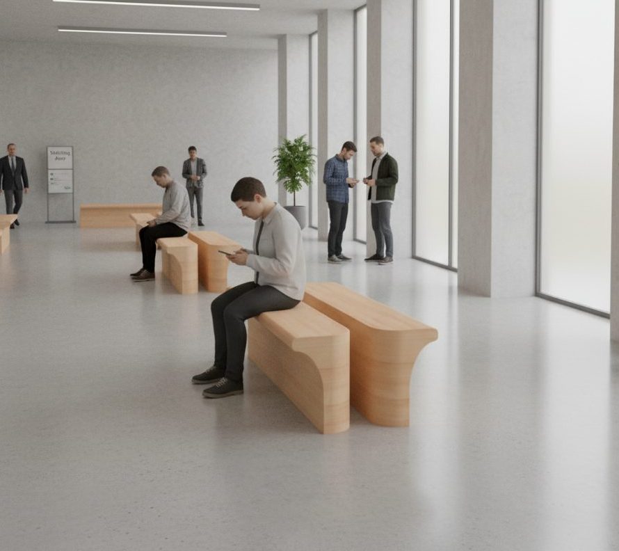 接合部分がゆるやかに引き延ばされることで、木材が持つ硬さのイメージを裏切るような、やわらかな動きを感じさせるベンチです。