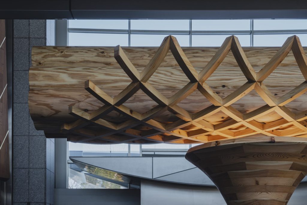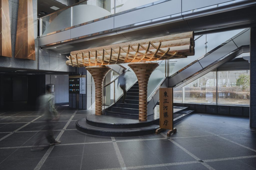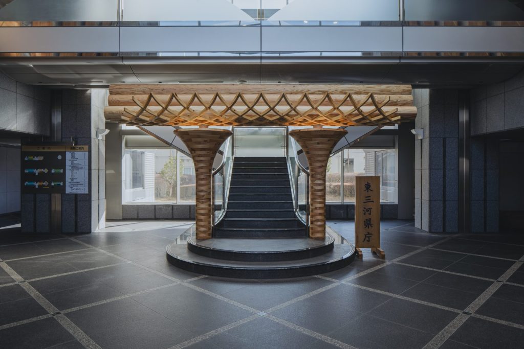 このプロジェクトは、東三河独自の建築文化や林業の歴史をリサーチする中で出会った「いっぽんもん」という伝統と、材木市場で積み重なる丸太のダイナミックな風景にインスピレーションを受けてスタートしました。 また、田口高校林業科の生徒さんたちが伐採した木材をモニュメントの一部に活用できたことで、「東三河の人・森・技術を繋ぐ」というコンセプトに強い説得力を持たせることができたと感じています。来庁される皆様には、この「いっぽん門」をくぐり、触れて、見上げていただくことで、木のパワーを五感で感じて頂きたいです。