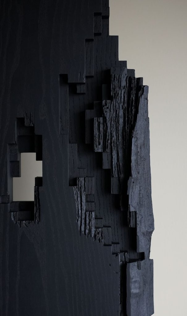 栗の木を使ったハイバックチェアである。栗材は虫に食べられやすく、それが原因で未利用になっている材がある。それらをスキャンし、虫に食べられたり、節・欠けが生じているところを手がかりに、ボクセル状に削りとることで、広葉樹の持つ曲線(自然)とデジタル(人工)を掛け合わせた形を生み出した。(VERCE公式HPより引用)