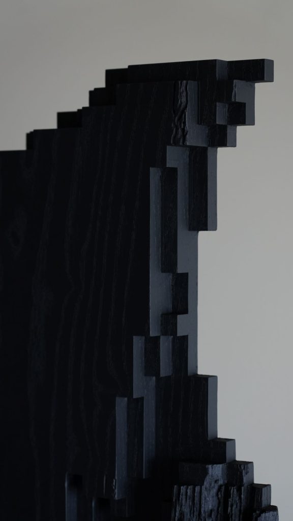 私たちは、捨てられた木材や未利用材を扱うとき、単に再利用自体を目的とするのではなく、素材がもともと備えていた形や意味をもう一度すくい上げることを大切にしています。素材に潜む偶然の形や、そこに刻まれた時間の痕跡を手がかりに、静かに佇む存在としての美しさを探しています。本作は「痕が導く形」として構想した栗材のハイバックチェアです。虫食い跡や節、欠けを理由に使われてこなかった栗材をスキャンし、それらの痕を起点にボクセル状に削り出すことで、広葉樹が本来もつ有機的な曲線とデジタル加工による人工的な形を掛け合わせた形を生み出しました。機械による加工と人の手による仕上げ。どちらか一方に委ねるのではなく、その往復のなかに、ものづくりの新しい可能性があると考えています